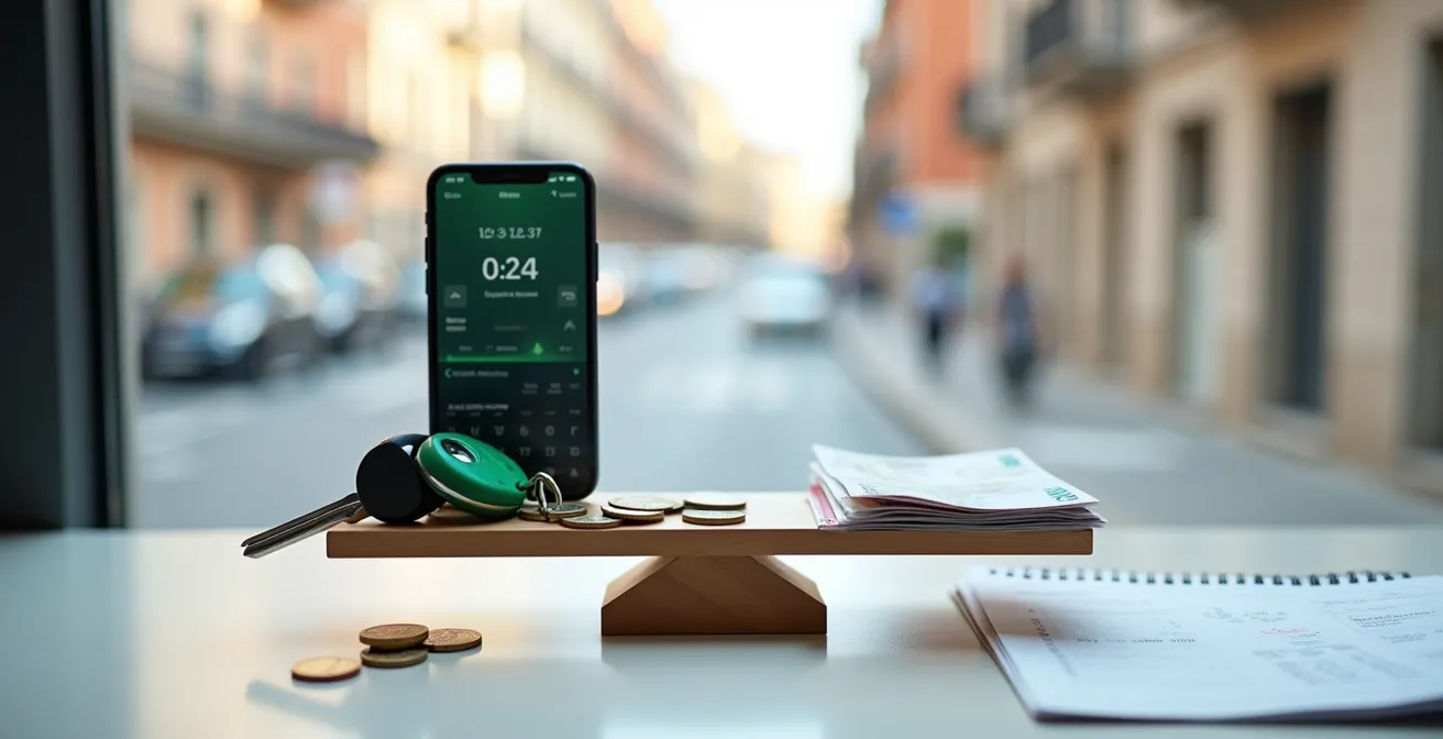 El debate sobre la movilidad personal suele simplificarse a una comparación de tarifas: euros por minuto frente a euros por día. Se asume que los viajes cortos son para el carsharing y los largos para el alquiler. Pero este enfoque ignora las variables más importantes que definen la eficiencia real de un desplazamiento en la ciudad moderna: el tiempo perdido, las restricciones geográficas, la carga mental del aparcamiento y, sobre todo, el riesgo financiero que asumimos con cada opción.